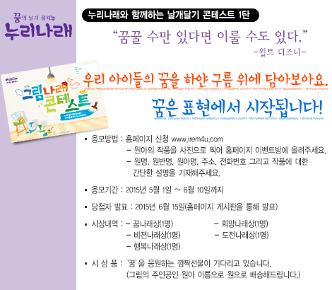 누리나래 그림나래 콘테스트 공지 페이지 정보 작성자 아이렘 댓글 0건 조회 3,569회 본문 누리나래의 첫 번째 이벤트인 "그림나래 콘테스트"입니다.선생님들의 많은 참여 부탁드립니다. 검색 목록 이전글자연 생태교육 프로젝트 연간 주제 안내 15.05.06 다음글누리나래 3호 어버이날을 위한 부모님 선물 교구 안내문 15.04.30 댓글목록 댓글 등록 시, 로그인이 필요합니다. 로그인 댓글목록 등록된 댓글이 없습니다.