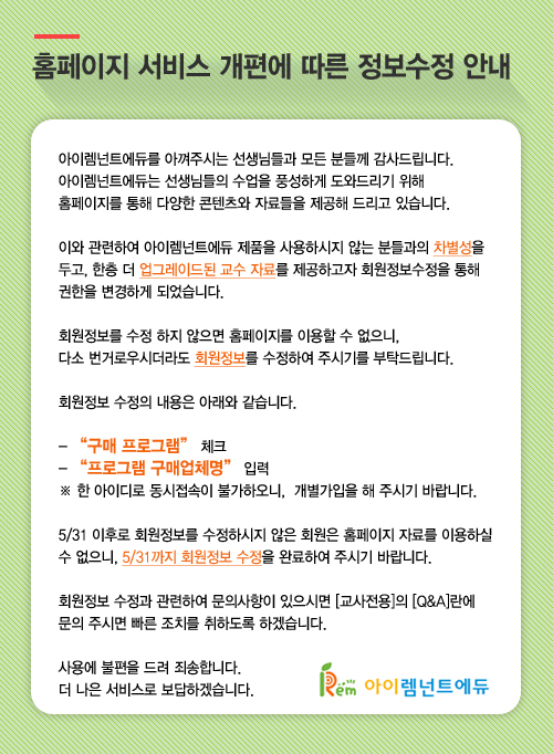 누리나래 홈페이지 서비스 개편에 따른 정보수정 안내 페이지 정보 작성자 아이렘 댓글 0건 조회 3,721회 본문 검색 목록 이전글3호 1단계 궁금한 나의 몸 교구 활용 안내 15.05.11 다음글자연 생태교육 프로젝트 연간 주제 안내 15.05.06 댓글목록 댓글 등록 시, 로그인이 필요합니다. 로그인 댓글목록 등록된 댓글이 없습니다.